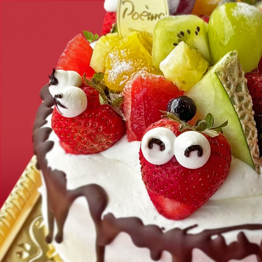 苺にくるくるの目をつけた、思わず笑顔になる遊び心いっぱいのケーキです。